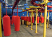 automatic electrostatic painting with powder coating RAL 3000 for fire extinguisher cylinders.